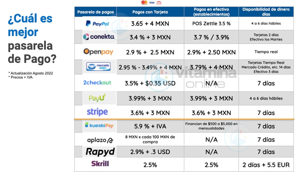 Adicional te compartimos esta tabla con las pasarelas de pago comisiones en México más utilizadas por nuestros clientes.